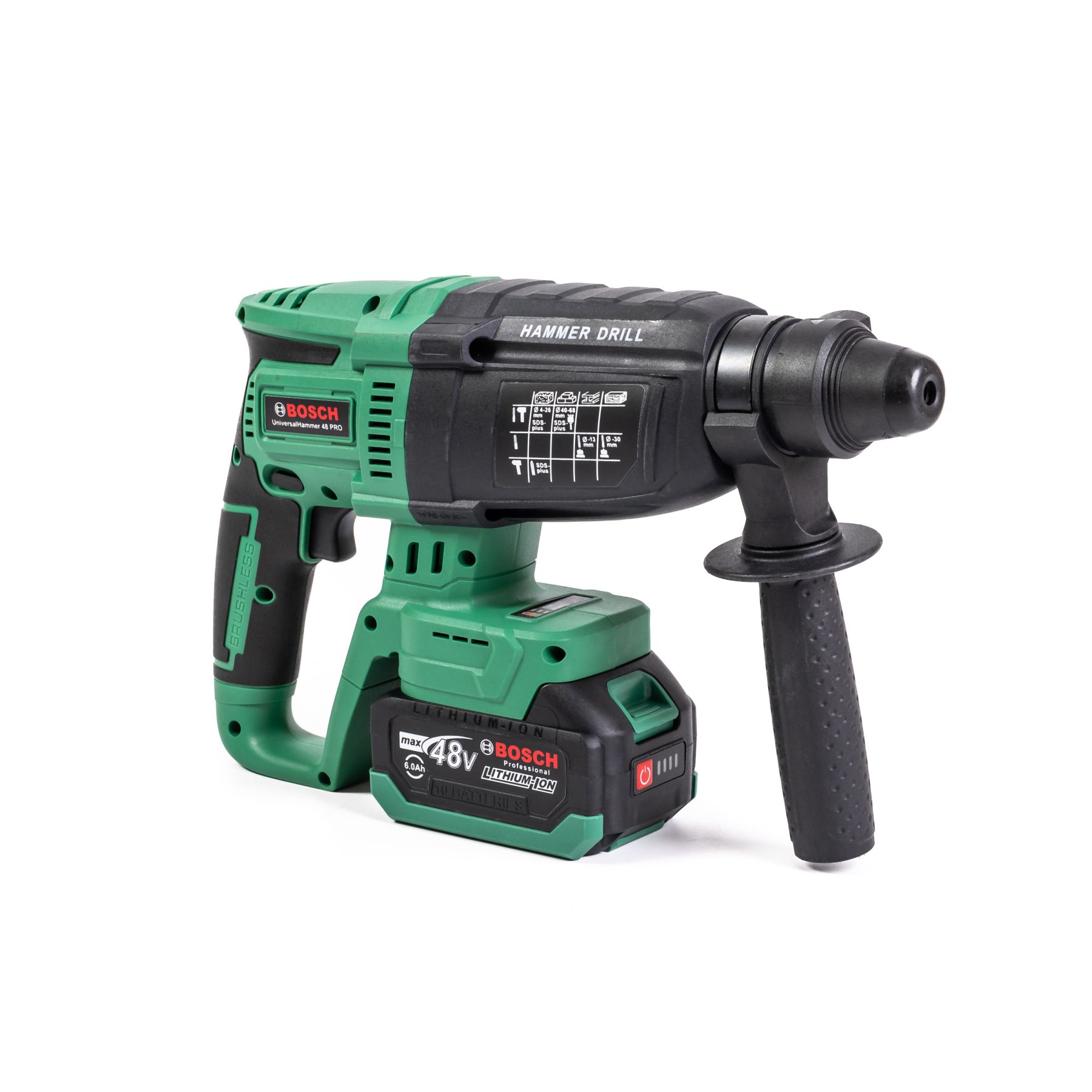 Bosch Universal Hammer 48 PRO — потужний (48В) безщітковий трирежимний перфоратор з енергією удару 3,3 Дж, призначений для буріння отворів в бетоні до 26 мм і роботи алмазними коронками до 68 мм.