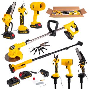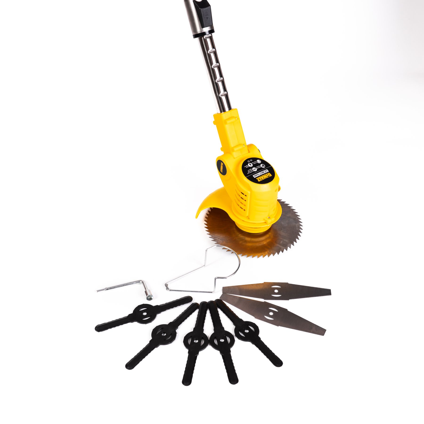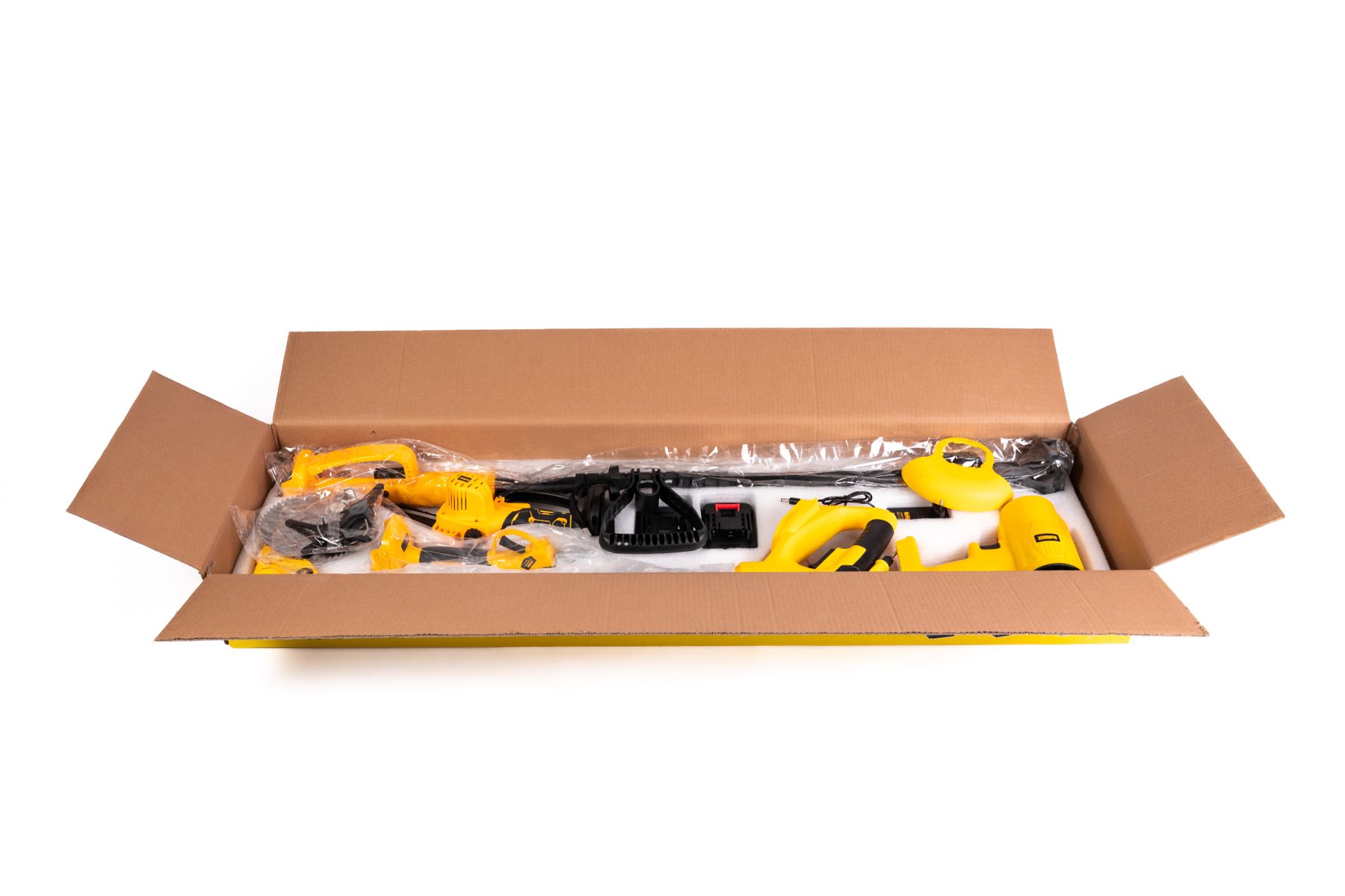 - Розширена комплектація містить захисний кожух, запасні ножі та ключі для секатора та набір дисків для тримера.