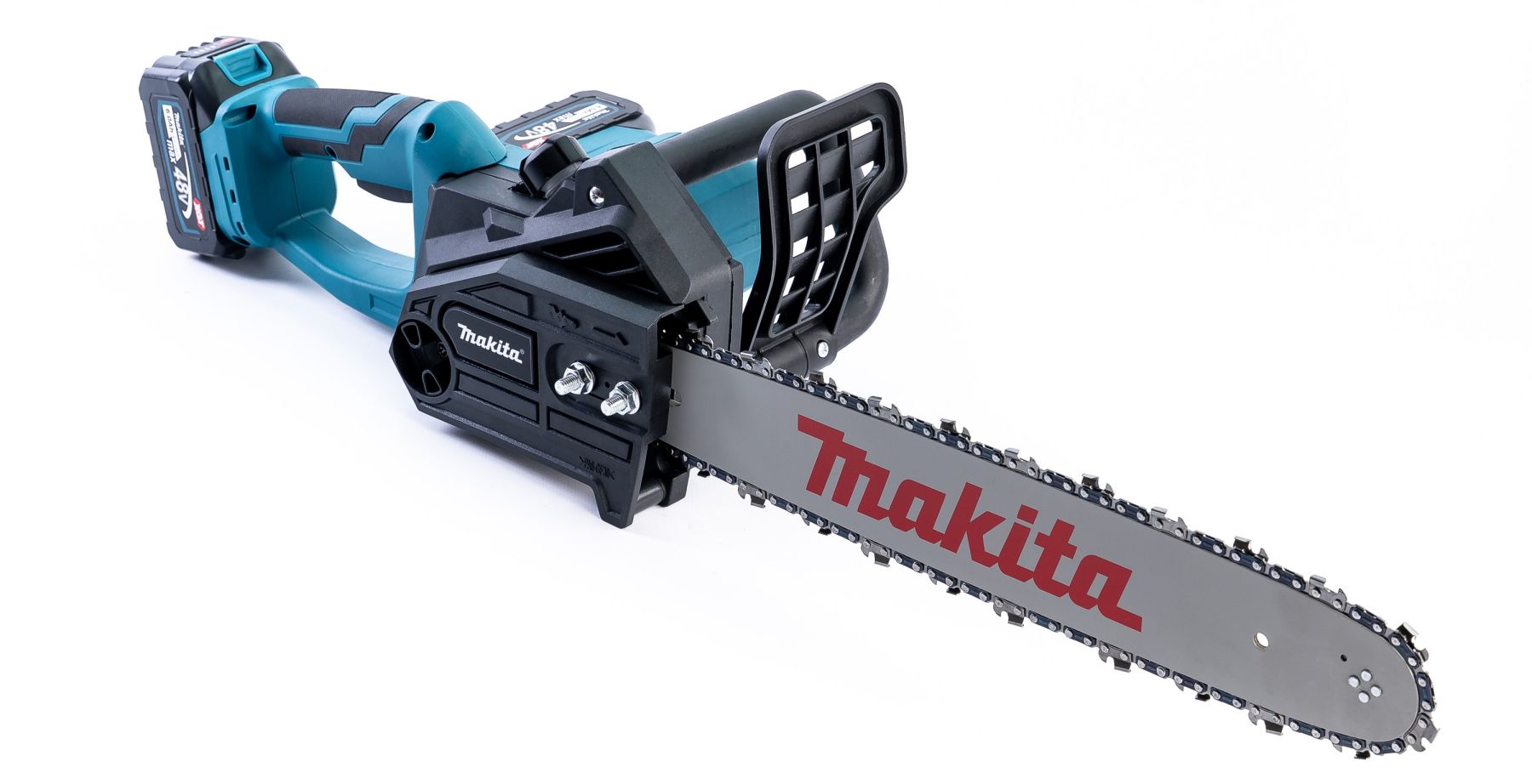 - Завдяки живленню двох акумуляторів, інструмент працює за напруги 48 вольтів, що гарантує високу швидкість різання та впевнене розпилювання навіть щільної деревини.